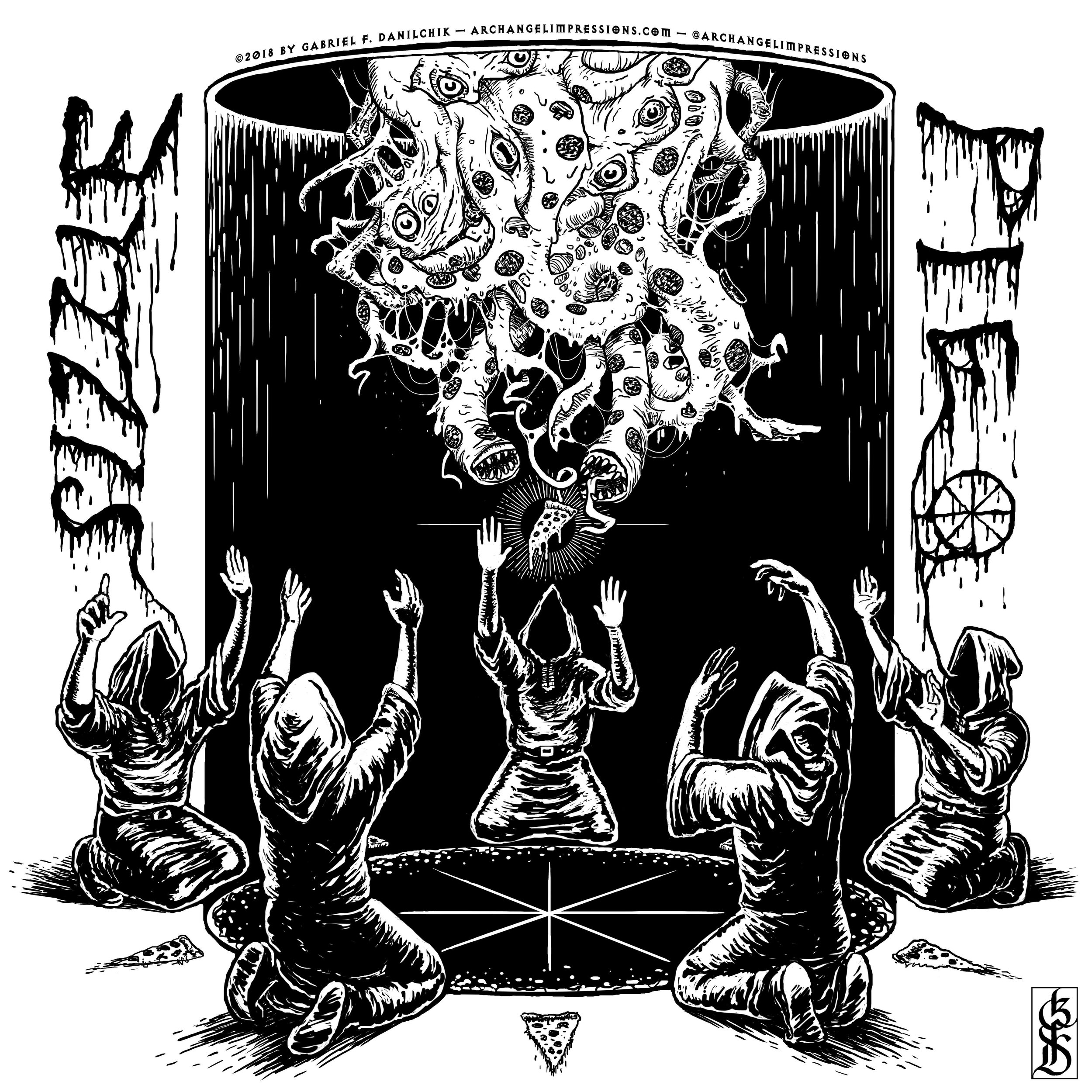 Cultists engaging in a dark ritual of pizza summoning.