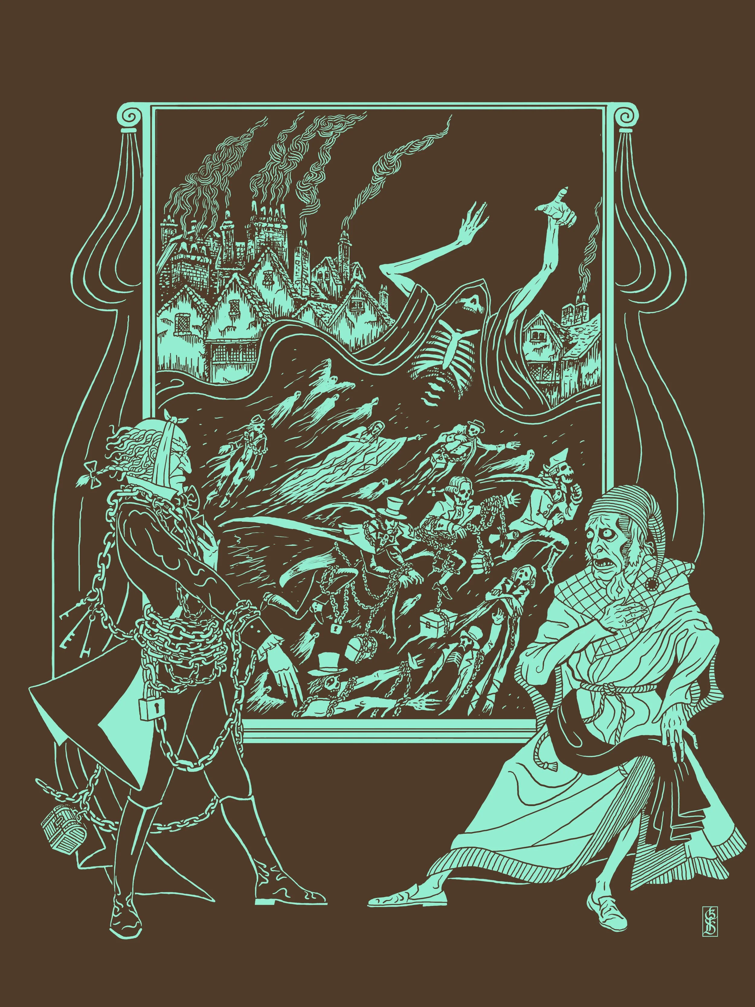 Jacob Marley and other ghosts terrorize Ebenezer Scrooge in this Harry Clarke-inspired take on Charles Dickens’ A Christmas Carol.